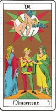 For comparison : Tarot 6 Crossroads: Here the moral of step 4 had its effects and Eros shoots down from above in the air. Possibly, both women correspond to Kreon's daughters Henioche ('Wagenlenkerin') and the red-haired Pyrrha (Greek: purrhos: colored flame, the name also appears in connection with Deucalion)